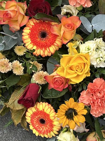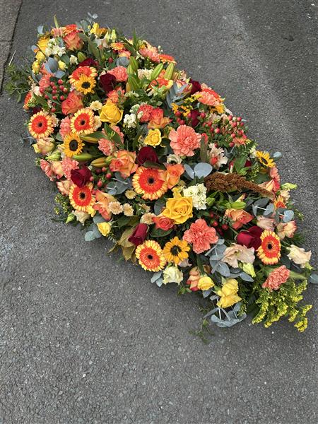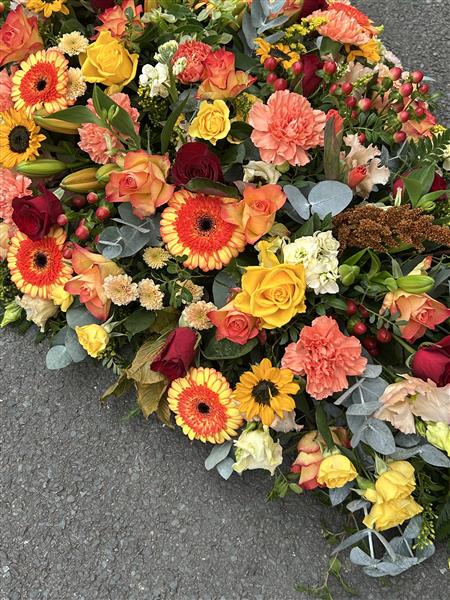 Lovely casket spray in multi shades of oranges & yellows.
