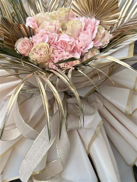 A dozen of the finest mondial roses, hydrangea heads, wrapped in the skirt style fashion for the ultimate wow effect!